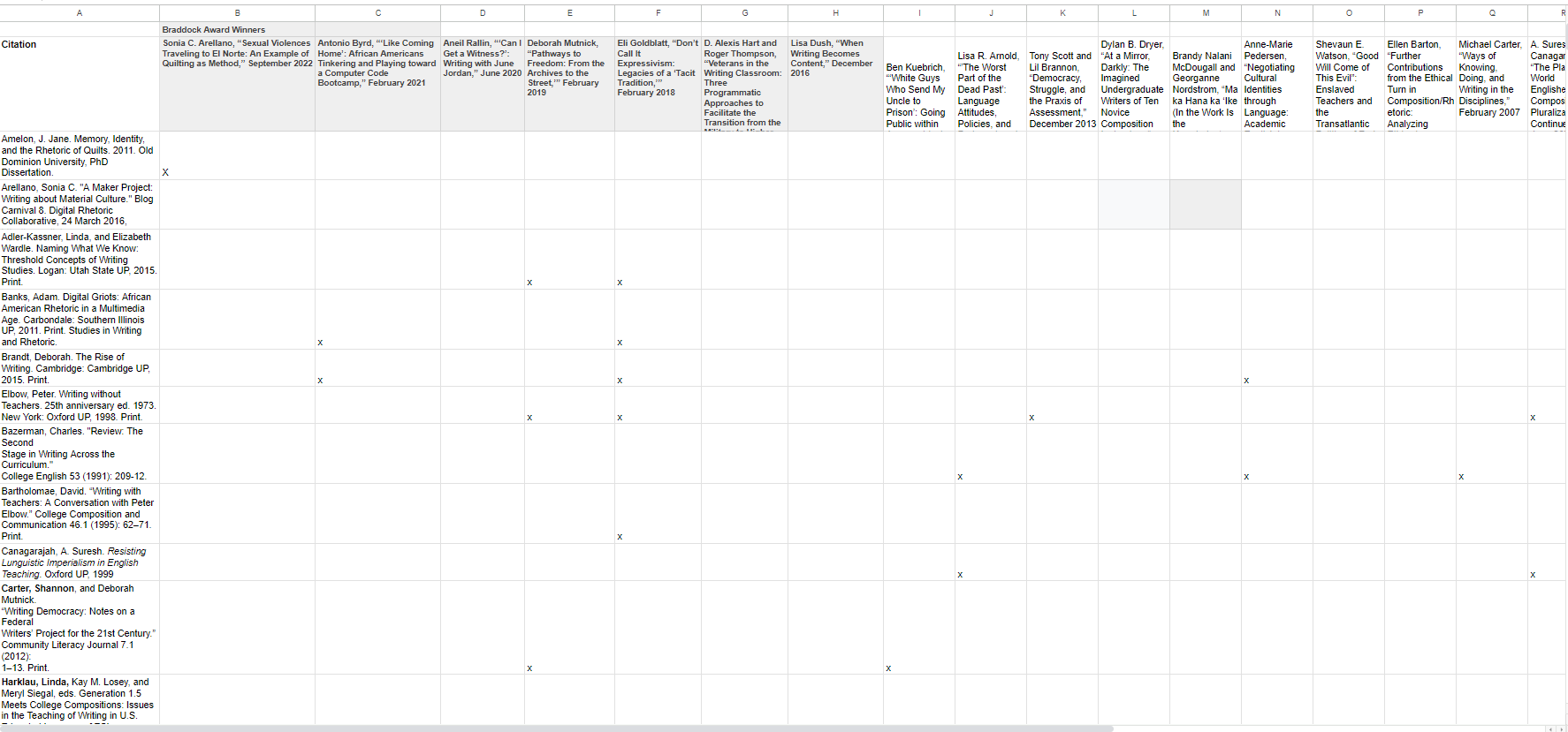 We looked through each award winner’s citations (mentioned above) to find if any of the award winners were citing the same scholars over a twenty-year period. We started with the most recent, Sonia Arellano’s, and listed each source she cited in a separate row. When that was complete, we began to list the next award winner, Antonio Byrd’s, sources, and if one had already been cited in Arellano’s article, we did not create a new row but instead put an “X” in the column under Byrd’s article so that, by the end, we could count (or create a formula to count) the number of times a particular article had been cited across the 20wenty years of award-winning articles. The link to the image below shows a small snippet of our spreadsheet. It is a really big image!